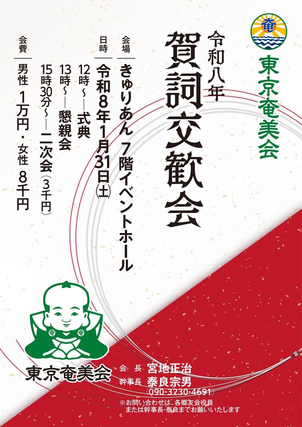 今年も、1月の東京奄美会の賀詞交歓会を皮切りに2月に東京笠利会新年会、4月から7月にかけ、宇宿校区会、赤木名校区会、笠利校区会、節田校区会、緑ヶ丘校区会、屋仁・川上校区会の総会・懇親会が開催され、10月には、第72回の東京笠利会総会・懇親会が開催されます。